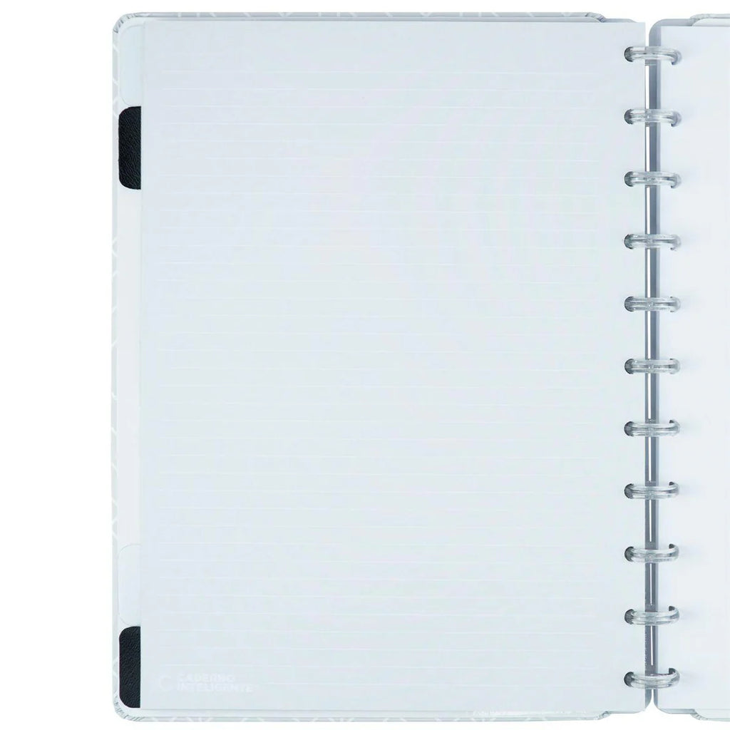 Um design único e sofisticado em cinza sólido e detalhes em high print. A experiência fica completa com as folhas linhas brancas. Um diferencial para estudantes e apaixonados por papelaria.